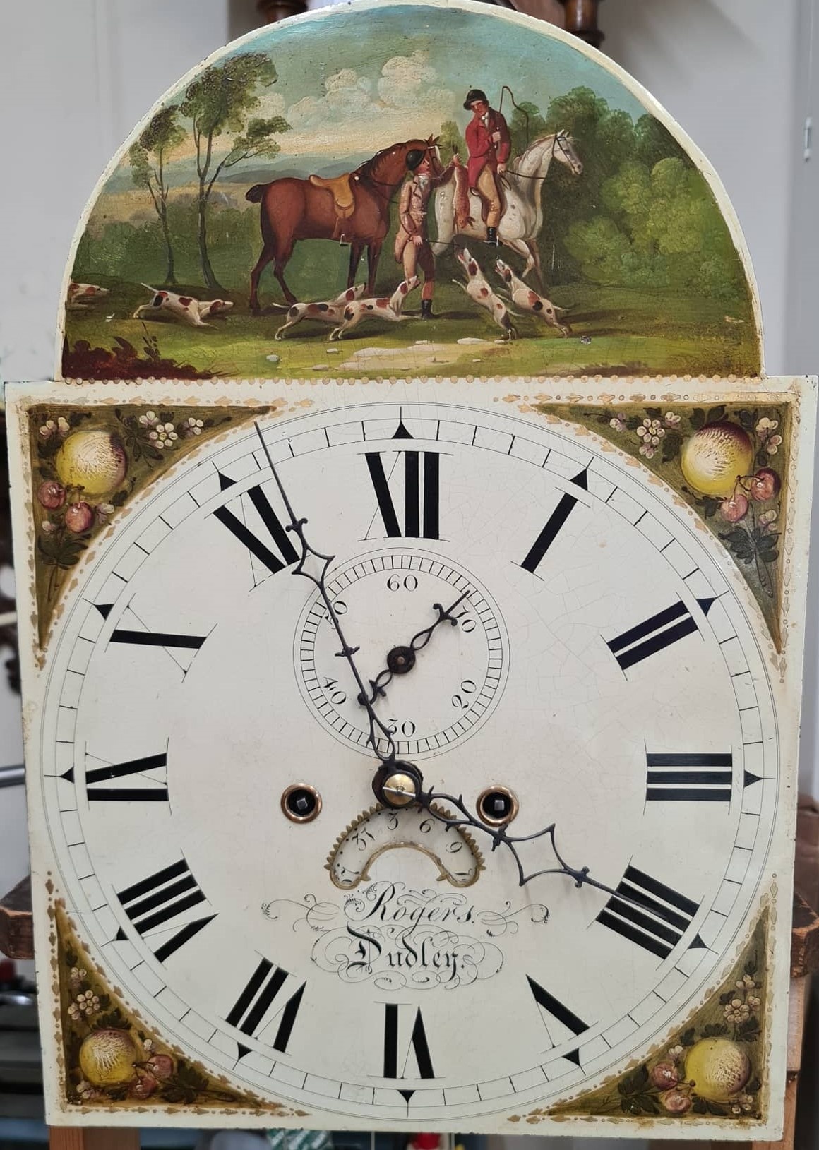 The clock with its original painted dial, with a superb Hunting scene to the upper arch of fine quality.