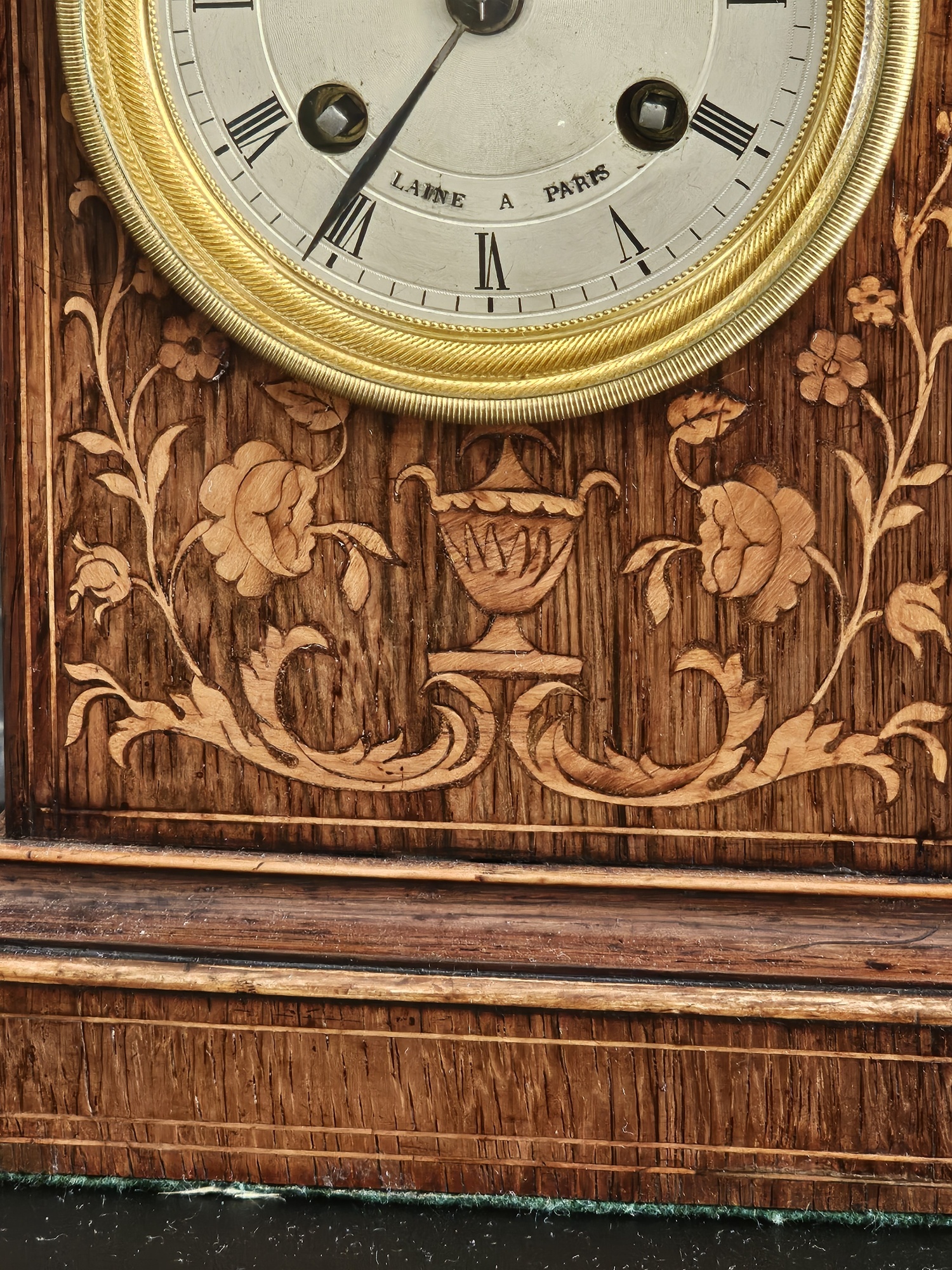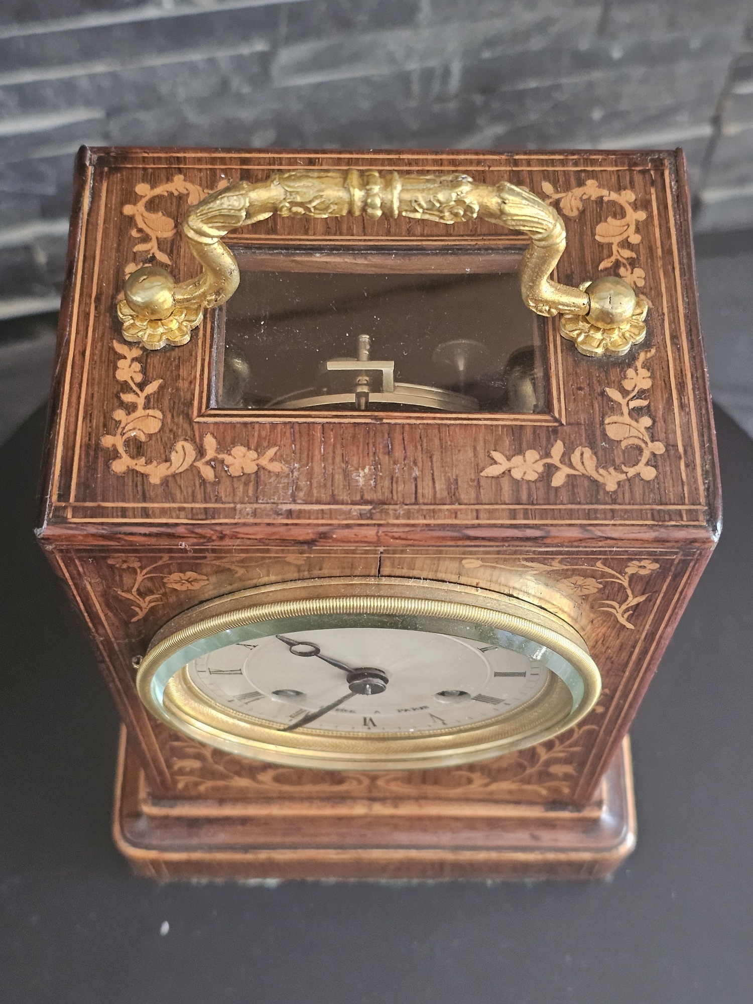 A beautiful example of a French Officers or Campaign clock by Laine of Paris, in Rosewood with marquetry inlays, and dating to circa 1830-1840. The clock has been fully cleaned and serviced, and the 8 day duration movement is in perfect working order. With a silk suspension and bell striking on the hours, with a passing single strike on the half hour, this is a lovely little clock. To the top is a glass viewing pane through which the movement can be viewed, with its ormulu carrying handle above. The rear door comes open be means of a working catch, and it measures 24cm high, x 14.5 cm wide and 11 cm deep