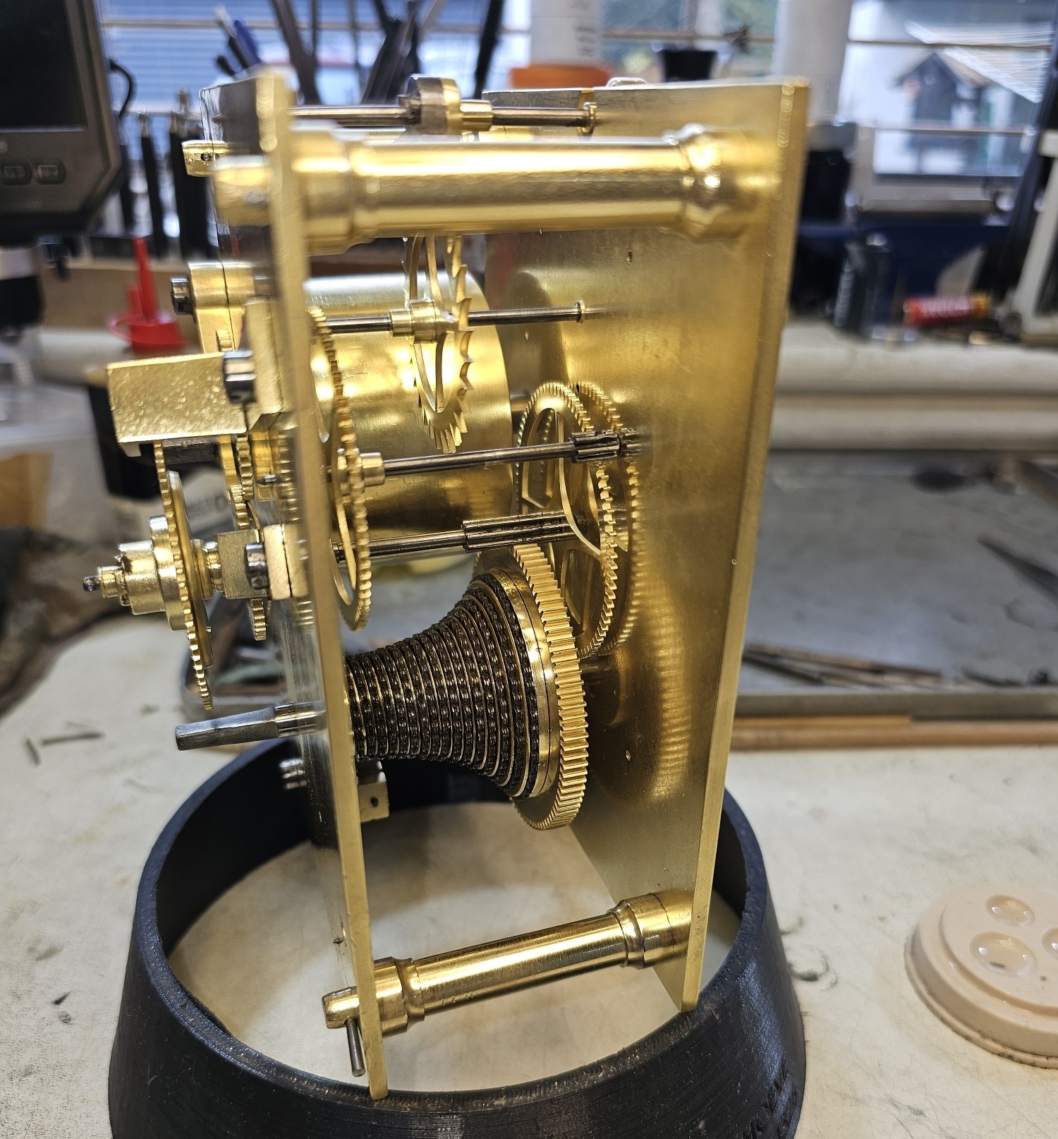 The traditional pegged case in Mahogany with brass bezel and locking lower door.